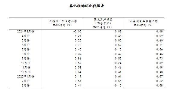 (2)根据季节调整模型自动修正结果,对近一年来各期国内生产总值、规模以上工业增加值、固定资产投资(不含农户)、社会消费品零售总额环比增速进行修订。修订结果及2025年一季度GDP环比数据、2025年3月份其他指标环比数据如下: