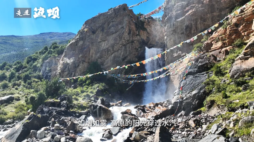 远处倾泻而下,发出轰鸣的瀑布,撞击在岩石上,溅起千朵银花,如烟如雾,高原的阳光穿过水汽,折射出七彩梦幻光芒。