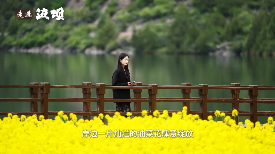 刚好这个季节,岸边一片灿烂的油菜花肆意绽放,风吹金浪,空中弥漫着悠悠花香。