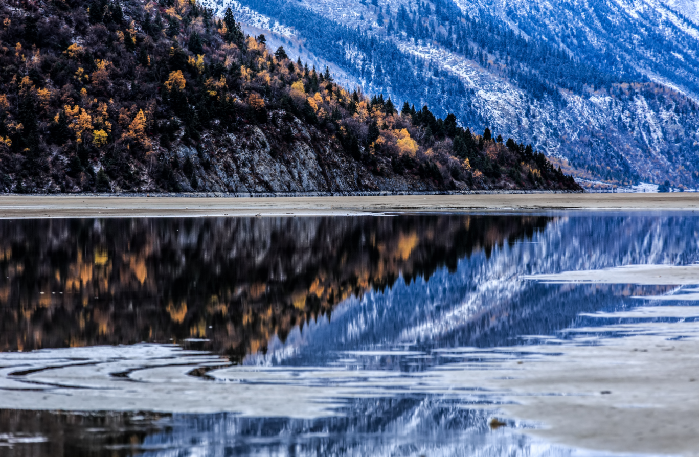 冷安佳布湖既具有青山绿水的精巧雅致又具有高山雪峰的雄壮瑰丽,尤其是在金秋时节,景色层次分明,湖水是清澈碧蓝,山脚是绿色,山腰呈金黄色,而山顶则是白雪覆盖,构成了一幅绚丽多姿的立体图画,使人恍若进入了仙境。