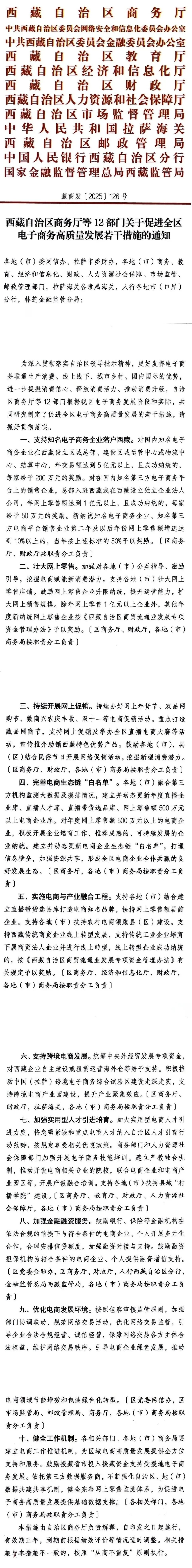 日前,西藏自治区商务厅官网公布了《西藏自治区商务厅等12部门关于促进全区电子商务高质量发展若干措施的通知》,包括支持知名电子商务企业落户西藏、壮大网上零售、持续开展网上促销、完善电商生态链“白名单”、实施电商与产业融合工程、支持跨境电商发展、加强实用型人才引进培育、加强金融融资服务、优化电商发展环境、健全工作机制十条内容。详情如下: