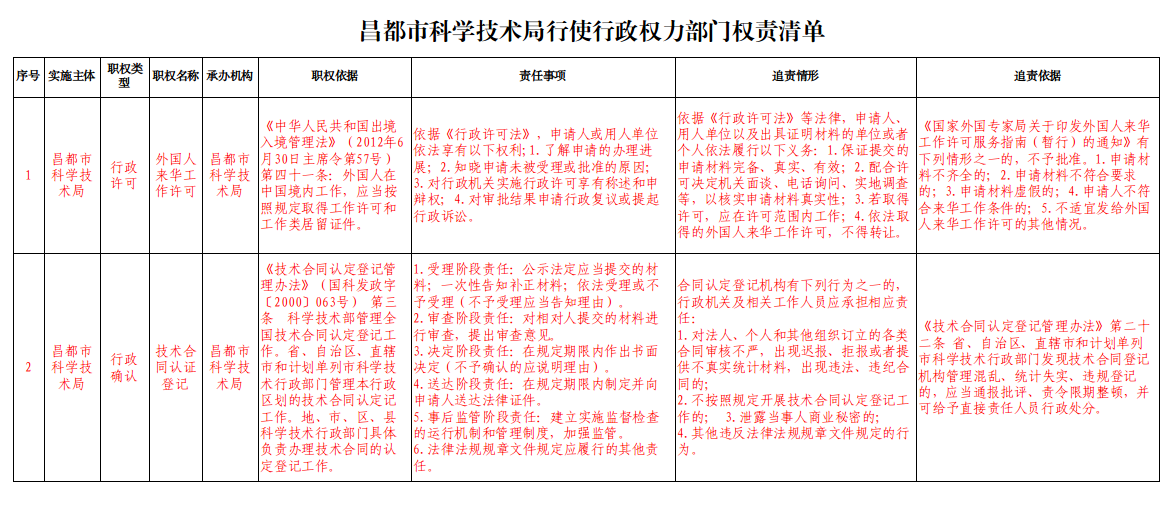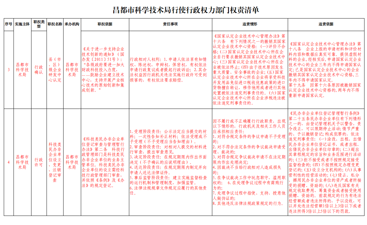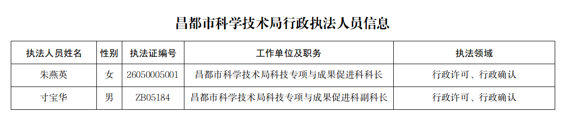 为深入推进依法行政,加快建设法治政府,提升行政执法规范化、透明化水平,现将昌都市科学技术局行政执法权责清单和行政执法人员信息公开公示。