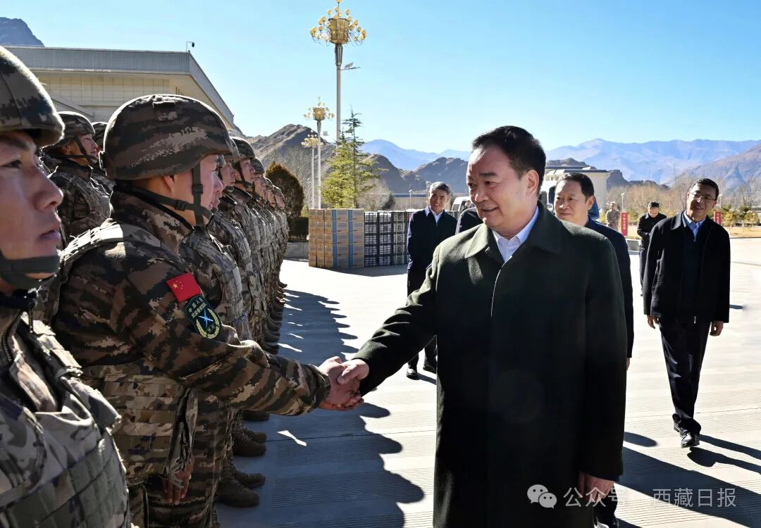 王君正强调,2026年是“十五五”开局之年,希望驻藏部队和武警官兵认真贯彻落实习近平强军思想和新时代军事战略方针,坚持党对人民军队的绝对领导,持续深化政治整训,加快先进战斗力建设,着力推进军民融合深度发展,践行人民军队根本宗旨,发扬优良传统,大力弘扬老西藏精神、“两路”精神,积极服务“四件大事”,争取更大光荣,为西藏长治久安和高质量发展作出新贡献。全区各级各部门要牢固树立国防意识和全局观念,更好支持国防和军队现代化建设,持续做好拥军优属服务保障工作,让大家“不为后路担心、不为后院分心、不为后代忧心”,始终做人民军队的坚强后盾和可靠后方。