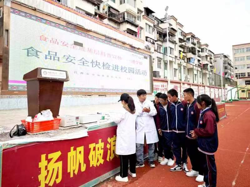 活动伊始,昌都市食品安全志愿者为在场师生讲授一堂食品安全公开课,详细讲解了避免食物中毒的预防措施,大力提倡营养膳食,同时呼吁同学们在日常生活中积极践行“光盘行动”,自发成为制止餐饮浪费的践行者。随后,快检人员现场展示了食品快速检测过程,并邀请同学们亲自现场采样、现场检测、现场公布检测结果的形式,为同学们提供充满感染力和趣味性的食品快检体验。最后组织开展食品安全知识有奖问答活动,进一步科普食品安全常识,并且鼓励他们将所学知识应用到日常生活中,从而形成良好的生活习惯和健康饮食习惯。
