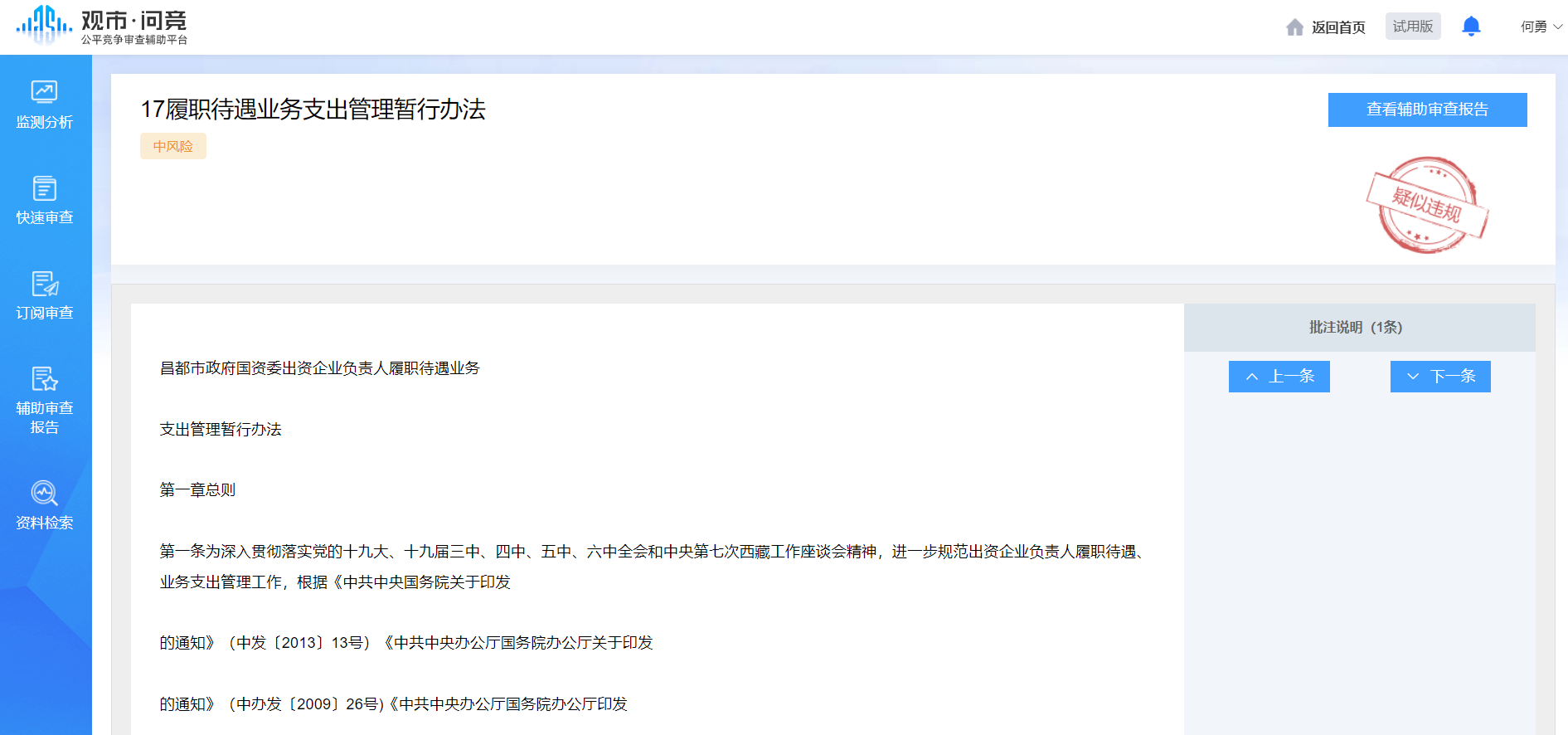 一是针对政府过度干预,存量政策“专项审查”难以常态化、增量政策“自我审查”质量难保障、审查人员业务水平不高、公平竞争“全局态势分析难实现”等现状,昌都市公平竞争审查联席会议办公室(昌都市市场监督管理局)依托北京拓普丰联信息科技股份有限公司研发的“观市·问竞”公平竞争审查辅助平台开展线上智能审查试点工作,并指导昌都市政府规范性文件审查科、昌都市文化局开展了本部门线上公平竞争审查工作。