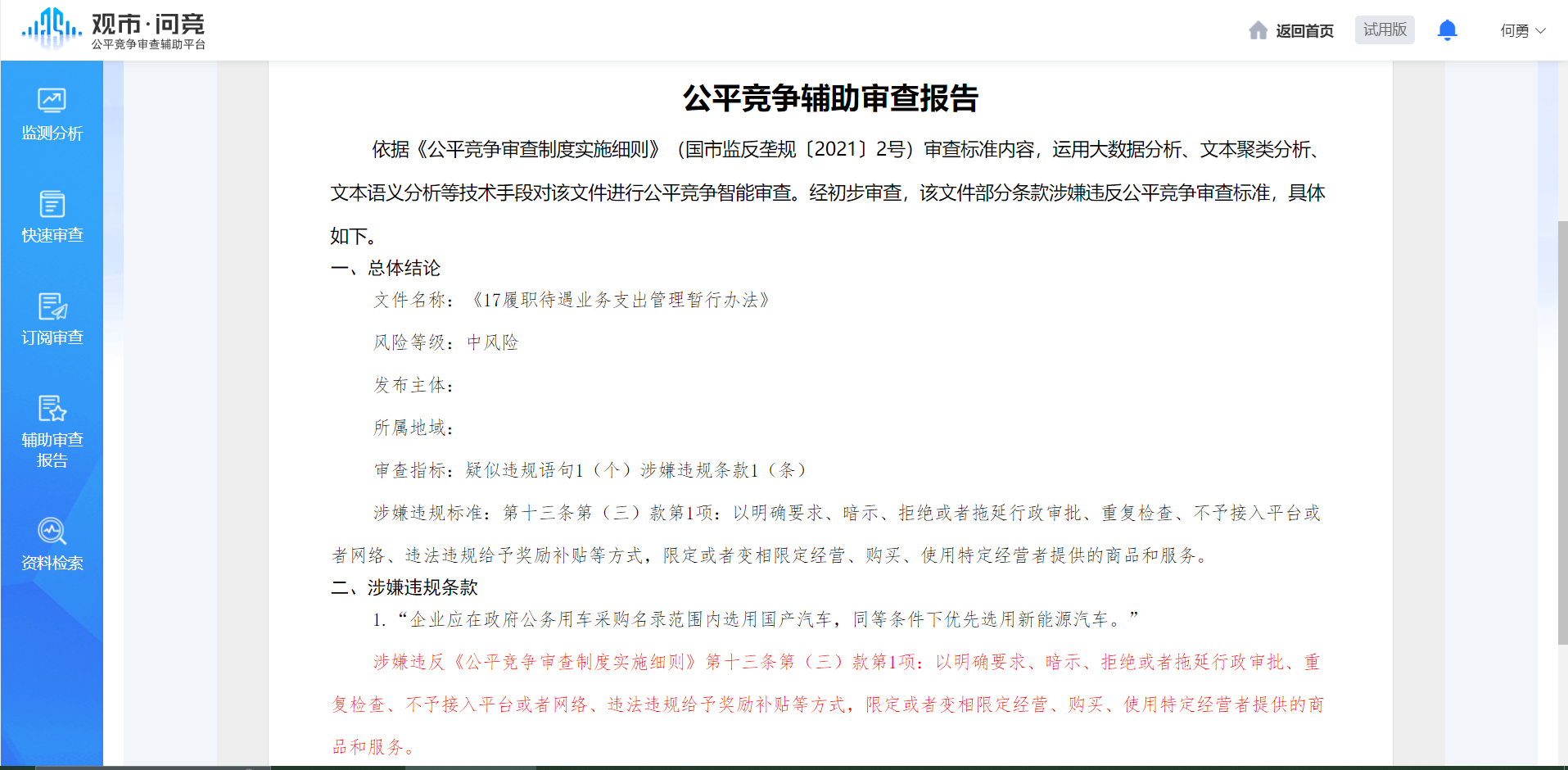 二是通过平台系统的人工智能、机器学习等技术,对各级机关制定的涉及市场主体经济活动的政策措施文件进行自主网上搜索、筛选、收集、整理审查,形成政策措施数据库,并对政策文件进行实时监控、动态跟踪,确保文件审查的全面性。自开展线上智能审查试点工作以来,已审查政策措施58件,发现疑似影响市场公平竞争的政策文件1件,政策制定部门根据线上风险评估启动了清理程序。同时,平台的智能算法对不符合公平竞争相关规定的内容能够进行识别、精准定位并详细说明违反哪一项标准,平均准确率超93%、识别率超过85%,为审查人员开展文件审查提供风险预警和参照依据。