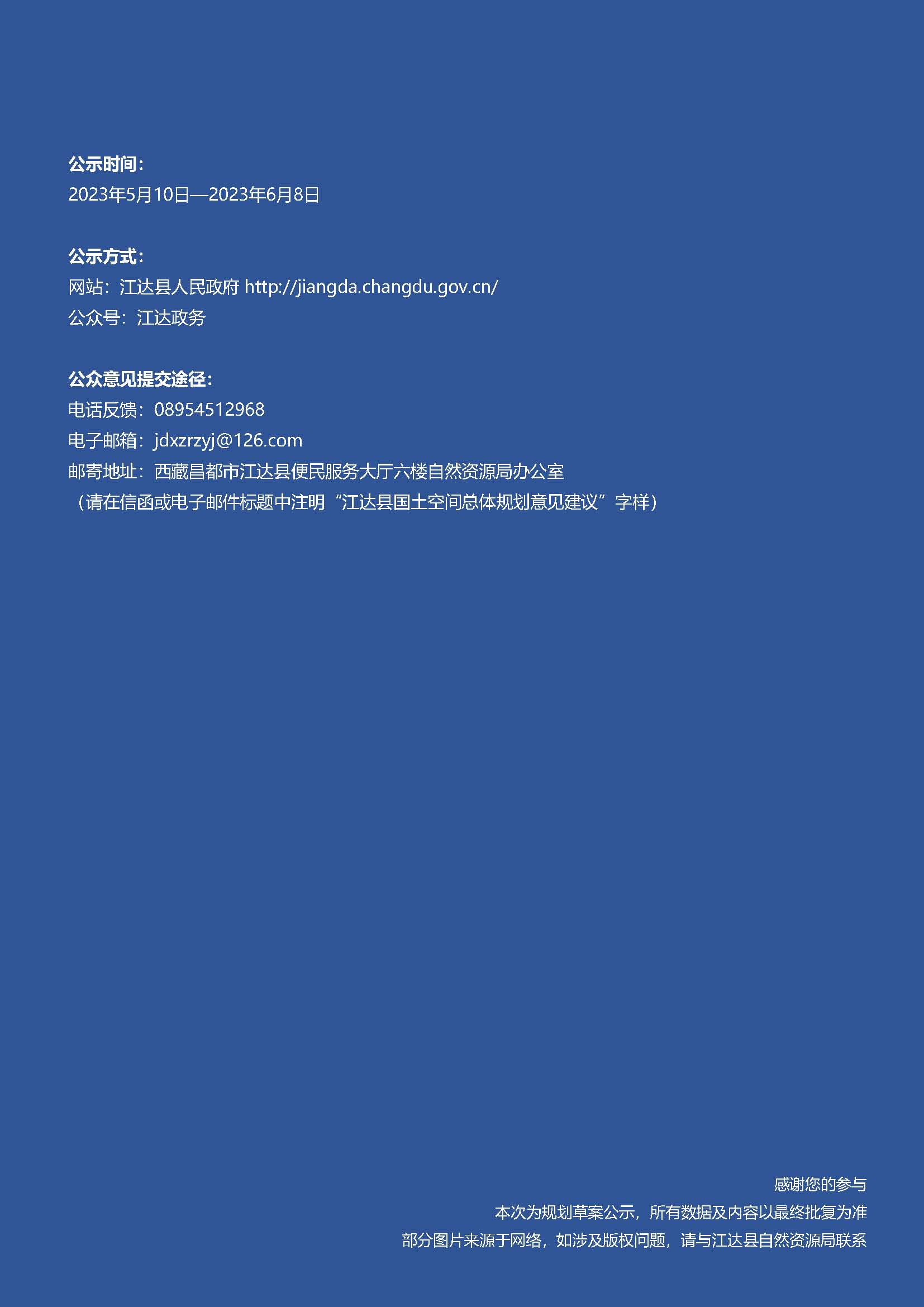 请在信函或电子邮件标题中注明“江达县国土空间总体规划意见建议”字样